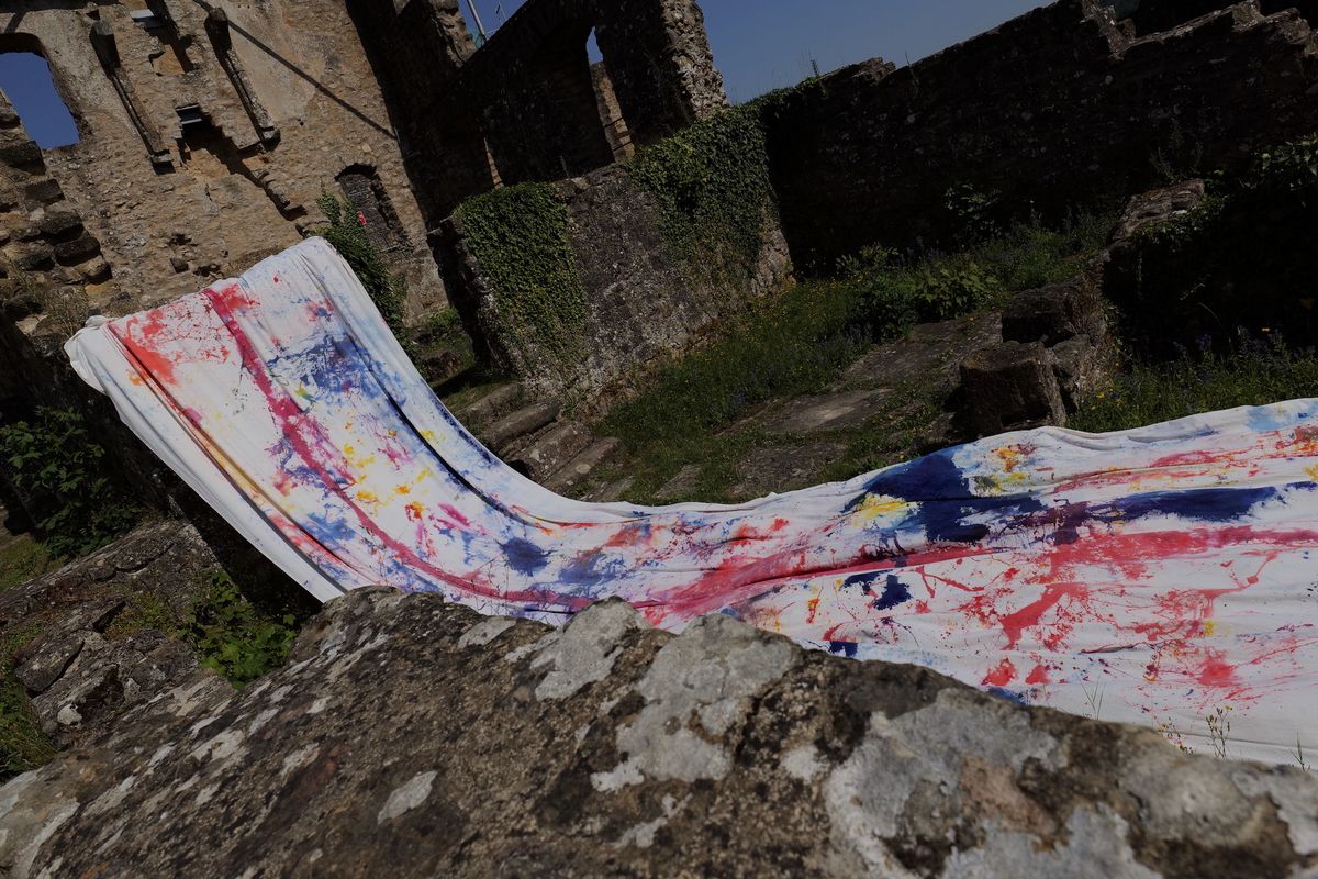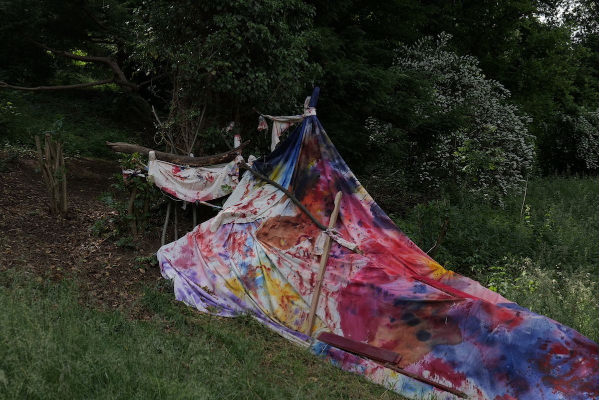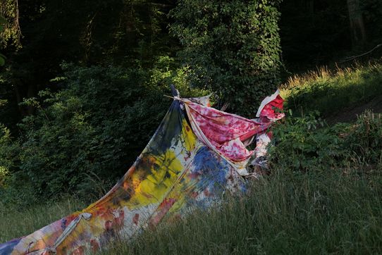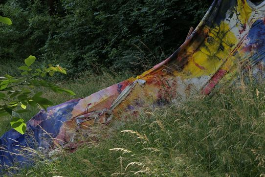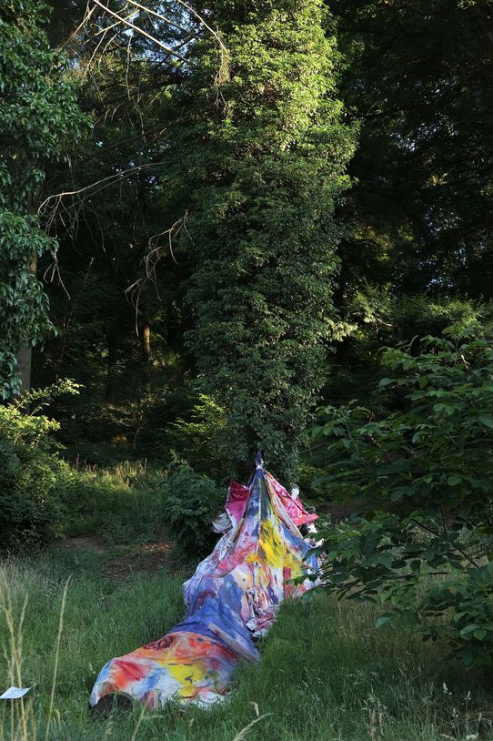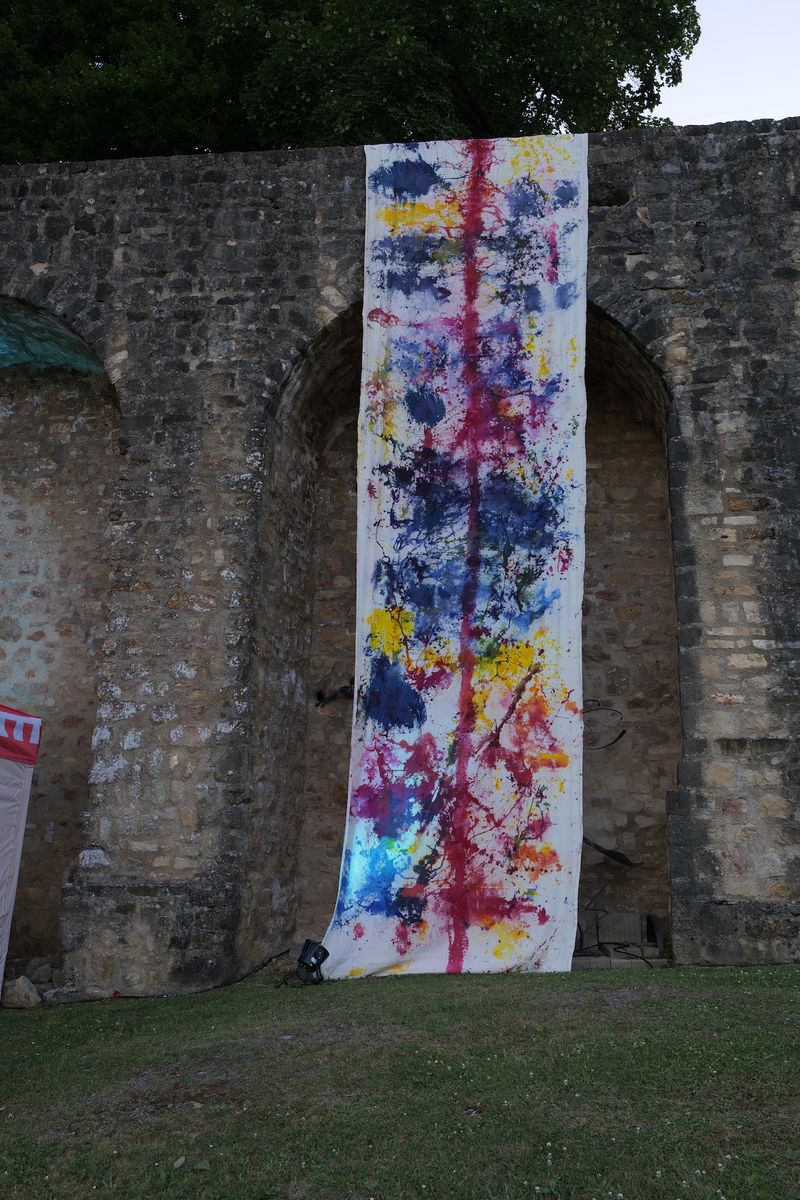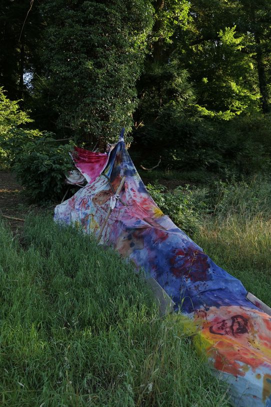 Der Kunstverein bat mich, für das Abschlußfest der Saison 2024 mit großen Tüchern, an denen ich seit Jahren arbeite, eine Deckenverspannung zu installieren, unter der das Fest stattfand.