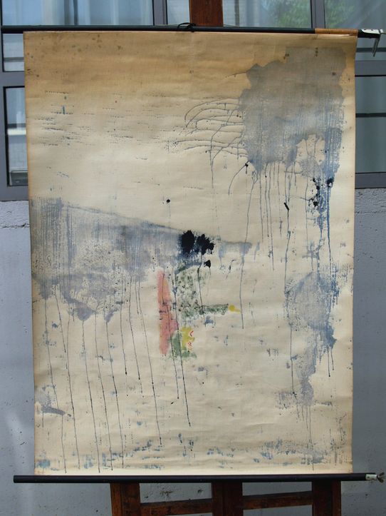 Tryptichen 0,40 x 2,20 m, Tusche und Öl auf Leinwand, Soldatenfiguren aus Kunststoff